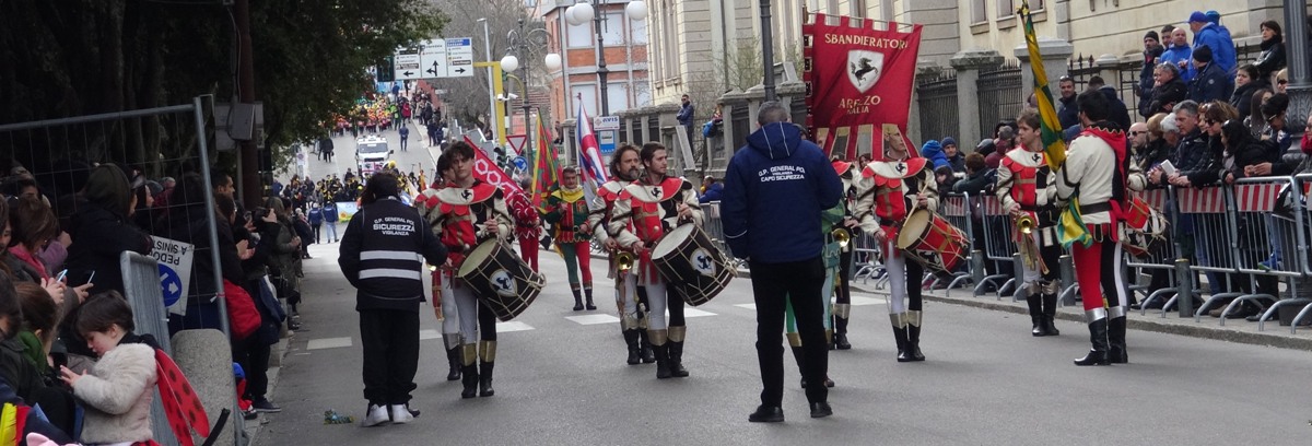 La sfilata dei bambini è stata preceduta dagli sbandieratori di Arezzo, oramai ci casa a Tempio per il Carnevale.