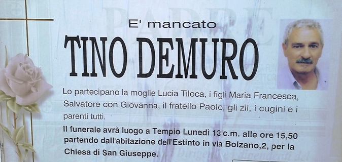 Tempio Pausania, 12 apr. 2015- Si è spento stamani a casa sua Tino Demuro, 68 anni da compiere proprio domani,…