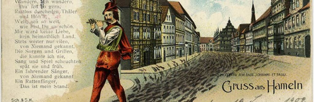 Narra la fiaba, che un pifferaio magico fosse in grado di allontanare i ratti dalla città di Hamelin. La sua suadente melodia, riuscì nell’impresa e giustamente egli pretese di essere pagato. La popolazione di Hamelin, però, si rifiutò di pagarlo e lui, per vendetta, sempre con la musica del suo piffero, allontanò dalla città tutti i bambini.