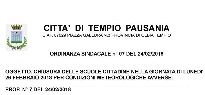 Tempio Pausania, Ordinanza di chiusura di tutte le scuole per la giornata di lunedì 26 febbraio.