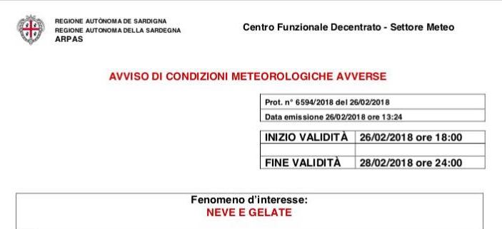 Tempio Pausania, 26 feb. 2018- Neve e gelate sino alla mezzanotte di mercoledì 28 febbraio 2018.
