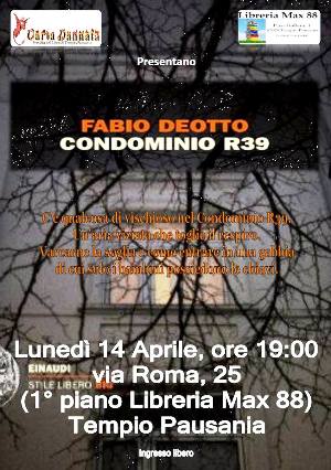 Lunedì 14 Aprile la Libreria Max 88 e l’Ass. Carta Dannata vi invita alla serata con Fabio Deotto che presenterà il suo thriller “Condominio R39”. L’incontro con l’autore e la presentazione del libro presso la libreria Max’88 al primo piano della libreria in via Roma, 25 alle ore 19.00.